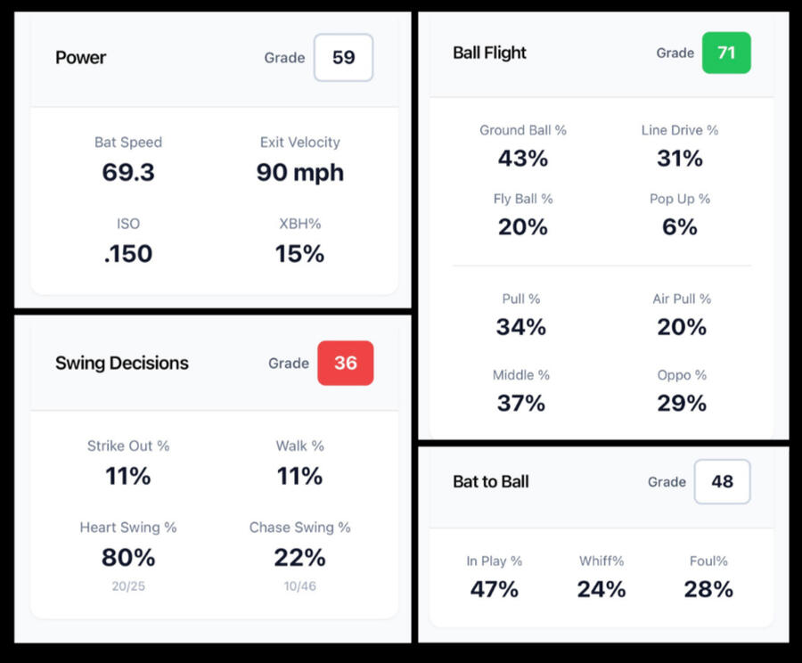 - It could be a couple things. For the Power grade, Bat Speed and Exit Velocity will need to be entered in separately, we can not track these in game. For the swing decisions grade, you will need to track the location of each pitch, to get a grade for your player.How is the grading scale set up?