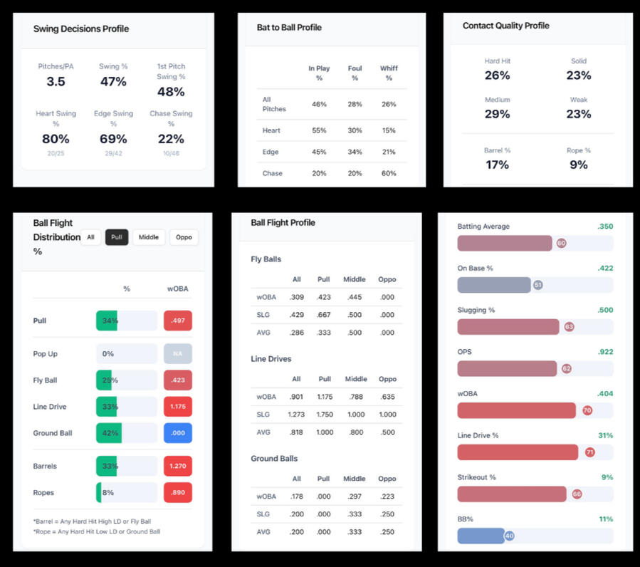Measures raw hitting power through ISO, extra-base hit rate, bat speed, and exit velocity.