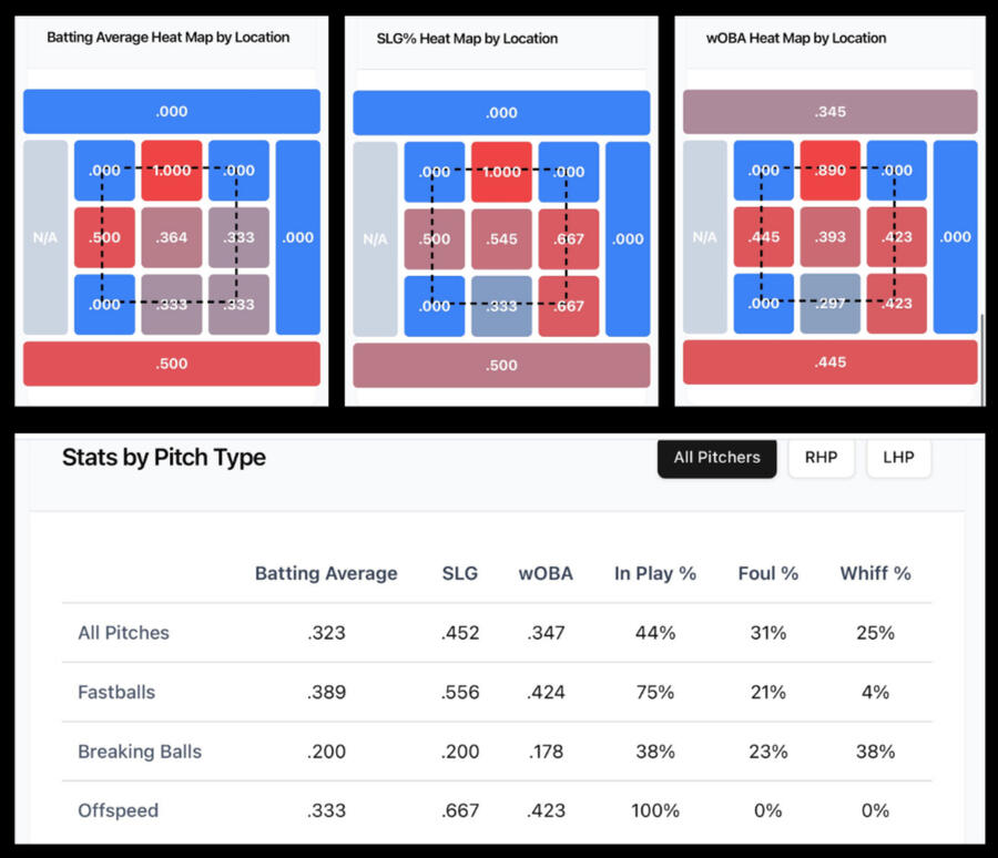 Visualize hot and cold zones. Filter by pitch type and pitcher handedness to spot tendencies and plan at-bats.